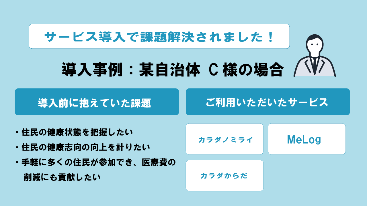 近年の少子高齢化社会の問題においても、地方自治体の取り組みは一段と強化していく必要があります。そのためにも住民の 健康状態を把握し、地域全体の健康増進を目指したいという地方自治体は多く、PHRサービスを活用した自治体も年々増えてきています。 地域全体で健康活動をスムーズに行うためにも、スマートフォンやPCで管理できる健康アプリの介入をおすすめします。